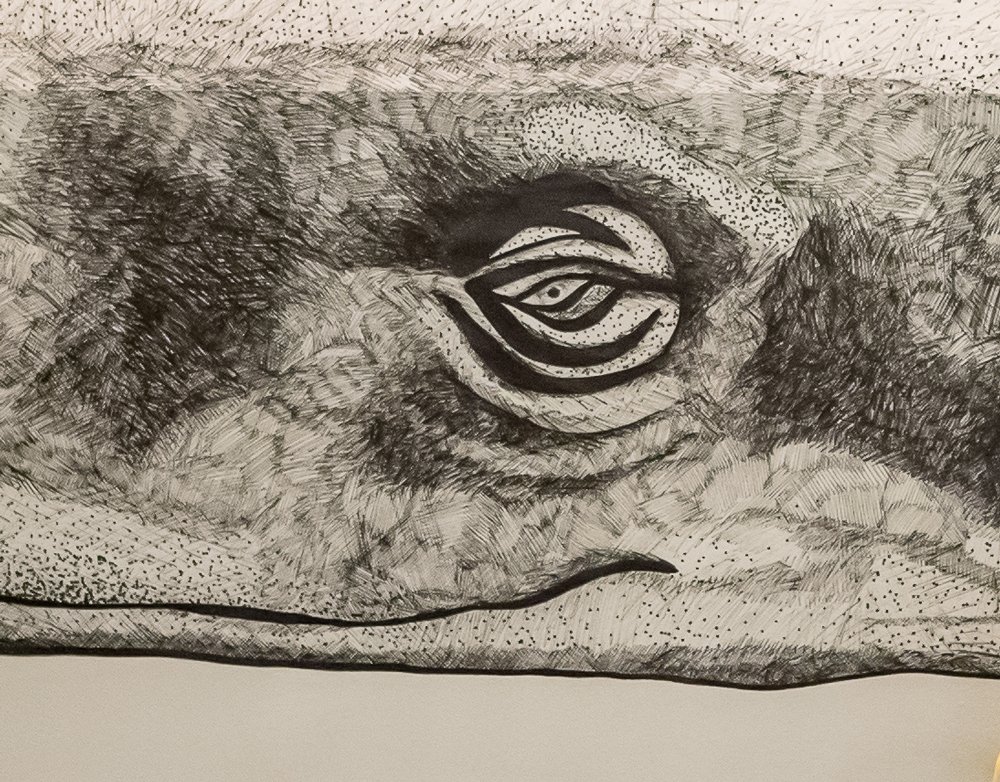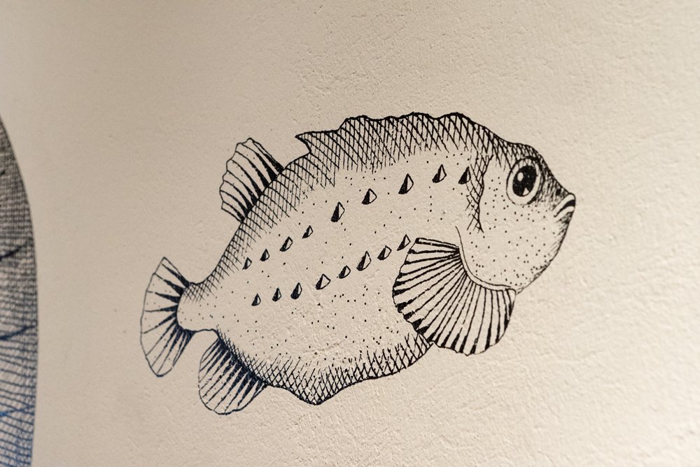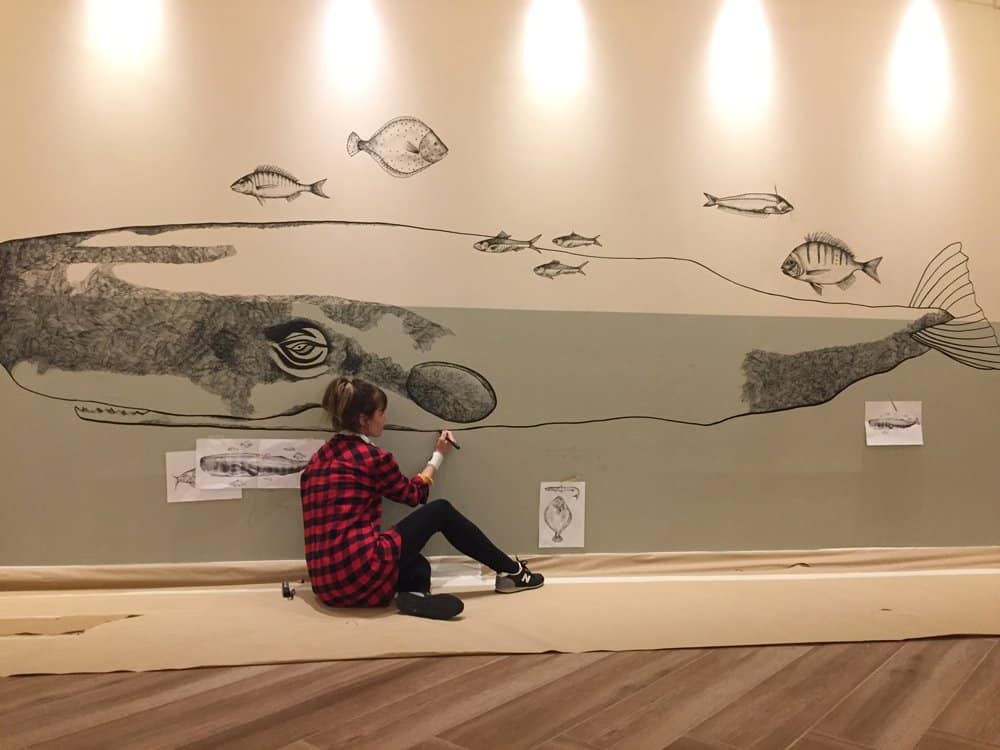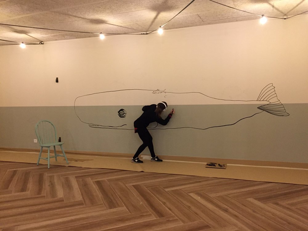 Il·lustració mural d’un catxalot per al restaurant Calau a Calella de Palafrugell.