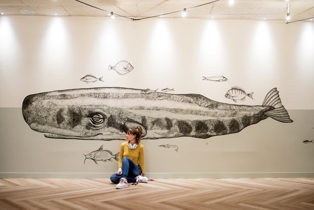 Mural illustration of a sperm whale for Calau restaurant in Calella de Palafrugell.